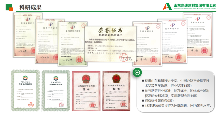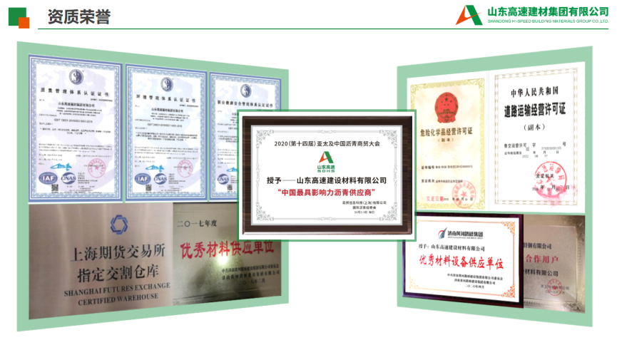7.公司簡介:公司簡介:山東高速瀝青有限公司是由山東高速集團(tuán)、美國海瑞集團(tuán)共同出資組建的中外合資企業(yè),注冊資本3.61億元人民幣,下轄7家權(quán)屬單位。 公司主要從事各類道路瀝青的研產(chǎn)、儲運、銷售以及公路、橋梁等防水材料的生產(chǎn)施工,公路、港口、鐵路、房建等建設(shè)材料的經(jīng)營業(yè)務(wù)等。瀝青公司堅持以創(chuàng)新為追求,以市場為導(dǎo)向,以客戶為核心,以價值為考量,致力于打造具有國際競爭力的世界一流建材綜合服務(wù)商。作為山東省道路材料經(jīng)營的龍頭企業(yè),瀝青公司在瀝青市場占有率居全國同行業(yè)第一位,建有改性瀝青生產(chǎn)線15條,擁有50萬噸以上的瀝青罐容、50萬噸以上的鋼材庫容、日運力5000噸專業(yè)瀝青車隊及山東2家上期所石油瀝青交割社會庫,參與建設(shè)了華北、華東、華中、西南、西北等5個區(qū)域26余個省市的高速公路和市政道路工程;參與了阿爾及利亞東西高速、埃塞俄比亞AA高速及朝鮮平壤重點公路等項目的材料供應(yīng),為國內(nèi)外公路、鐵路建設(shè)做出了重要貢獻(xiàn)。公司將技術(shù)創(chuàng)新作為可持續(xù)發(fā)展的動力,與中國石油大學(xué)、山東交通學(xué)院、美國海瑞集團(tuán)等開展了有效深入合作,科研創(chuàng)新軟實力進(jìn)一步增強。2008年至今,先后承擔(dān)20余項交通運輸部、省交通運輸廳等政府部門立項科技項目,獲得山東省科技進(jìn)步獎、中國公路學(xué)會科學(xué)技術(shù)獎、山東公路學(xué)會科學(xué)創(chuàng)新獎、交通科學(xué)技術(shù)獎等政府、行業(yè)獎項共16項,參與制定行業(yè)標(biāo)準(zhǔn)、地方標(biāo)準(zhǔn)、團(tuán)體標(biāo)準(zhǔn)共9項、在制定地方標(biāo)準(zhǔn)3項,授權(quán)發(fā)明專利27項、實用新型專利18項、在申請發(fā)明專利14項,擁有軟件著作權(quán)9項,省級工法1項,鑒定科技成果18項,發(fā)表學(xué)術(shù)論文18篇,獲批一個集團(tuán)級科研平臺--瀝青新材料研發(fā)平臺,科技創(chuàng)新成效初顯。