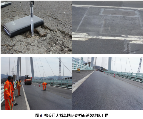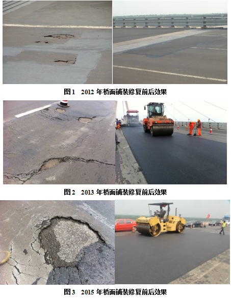 濟(jì)南黃河三橋是青銀高速濟(jì)南繞城大北環(huán)段跨越黃河的一座特大橋,該橋主橋規(guī)模在當(dāng)時(shí)同類(lèi)橋梁中位居世界第二、亞洲第一。原橋面采用環(huán)氧瀝青混凝土鋪裝而成,2008年年底通車(chē)。2010年?yáng)|南端橋頭橋面鋪裝出現(xiàn)開(kāi)裂,泛出銹跡;2011年橋面開(kāi)裂位置松散和脫落,橋面板裸露,采用進(jìn)口修復(fù)膠進(jìn)行修復(fù);2012年,修復(fù)位置旁又出現(xiàn)大面積脫落和銹蝕,其他部位相繼產(chǎn)生了推移、開(kāi)裂、脫落等損壞。2012年起至今,逐年應(yīng)用A1型、B型新型高黏瀝青進(jìn)行養(yǎng)護(hù)維修,應(yīng)用至今未產(chǎn)生任何病害,工程成本僅約為原鋪裝材料的1/3。