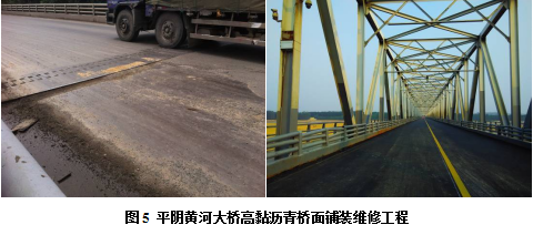 平陰黃河大橋?yàn)殇撹旒芙Y(jié)構(gòu)橋,是105國(guó)道上的重要橋梁,全長(zhǎng)963.52m。維修前主要病害為開(kāi)裂及松散,橋頭及伸縮縫部位鋪裝層脫落嚴(yán)重,橋面板大面積裸露。2014年采用A1型、B型新型高黏瀝青進(jìn)行全橋橋面鋪裝層重鋪,使用至今未發(fā)生任何病害。