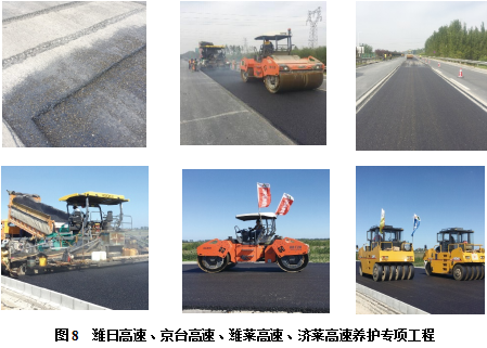 2016年,C型新型聚合物高黏瀝青應(yīng)用于濰日高速水穩(wěn)預(yù)開(kāi)裂后的下面層,試驗(yàn)段效果良好,并應(yīng)用于京臺(tái)高速曲阜段基層病害處治,效果良好;2017和2020年C型新型聚合物高黏瀝青分別在京臺(tái)高速、濰萊高速、濟(jì)萊高速濟(jì)南段及威青高速養(yǎng)護(hù)專(zhuān)項(xiàng)工程中使用。
