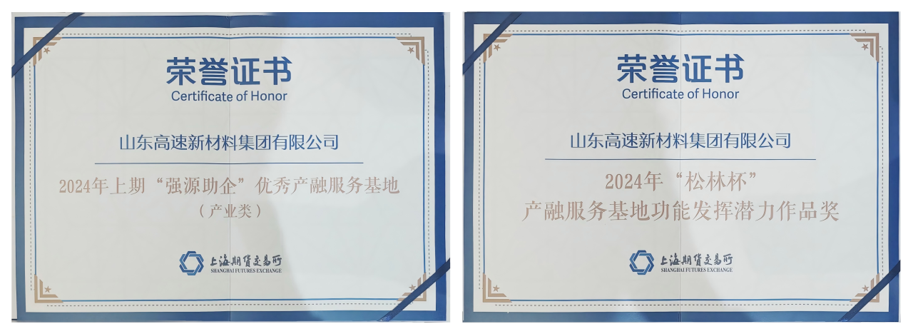 近日,上期所舉辦2024年“松林杯”產(chǎn)融服務基地功能發(fā)揮作品展映暨產(chǎn)業(yè)服務工作座談會。會上,對在產(chǎn)融服務方面表現(xiàn)突出的單位進行了表彰。山東高速新材料集團有限公司憑借卓越的市場表現(xiàn)和深厚的專業(yè)實力,榮獲2024年上期“強源助企”優(yōu)秀產(chǎn)融服務基地(產(chǎn)業(yè)類)稱號,以及“松林杯”產(chǎn)融服務基地功能發(fā)揮潛力作品獎。